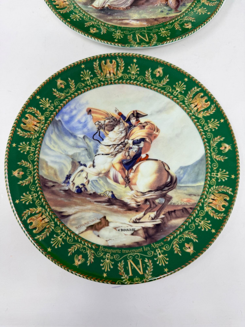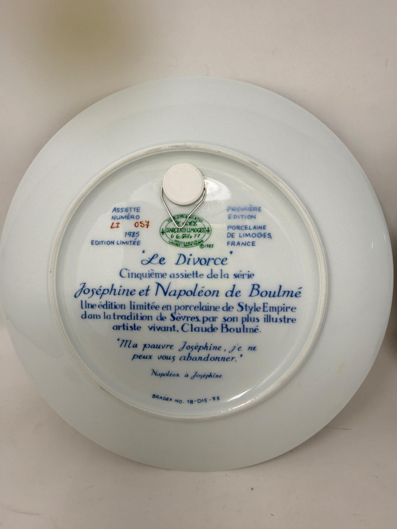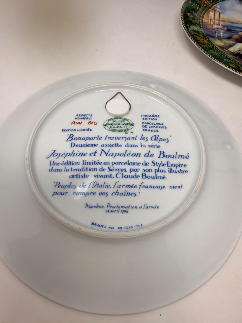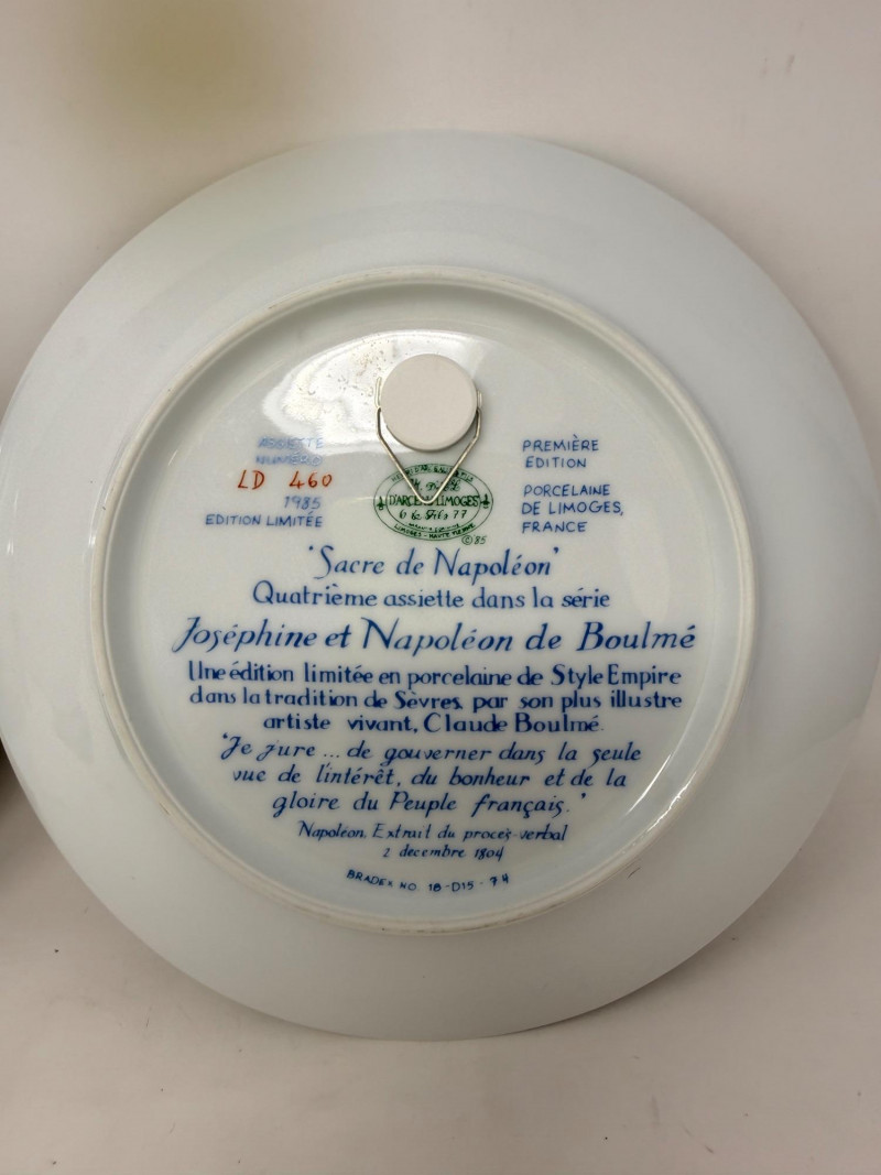 (4) Limited Edition Porcelain Limoges Plates by Claude Boulme. 8.5” Le Divorce #057 Sacre de Napoléon #460 L’Impératrice Joséphine #696 Bonaparte traversant les Alpes #815
