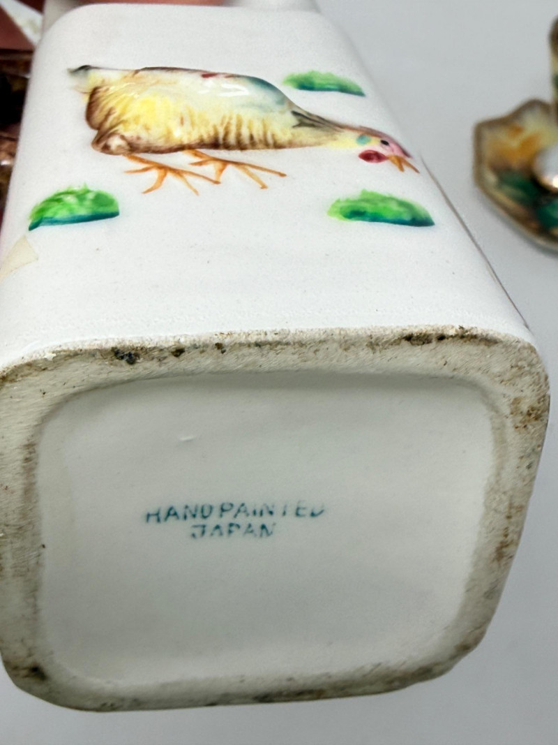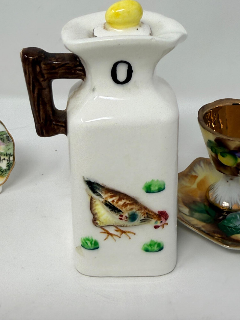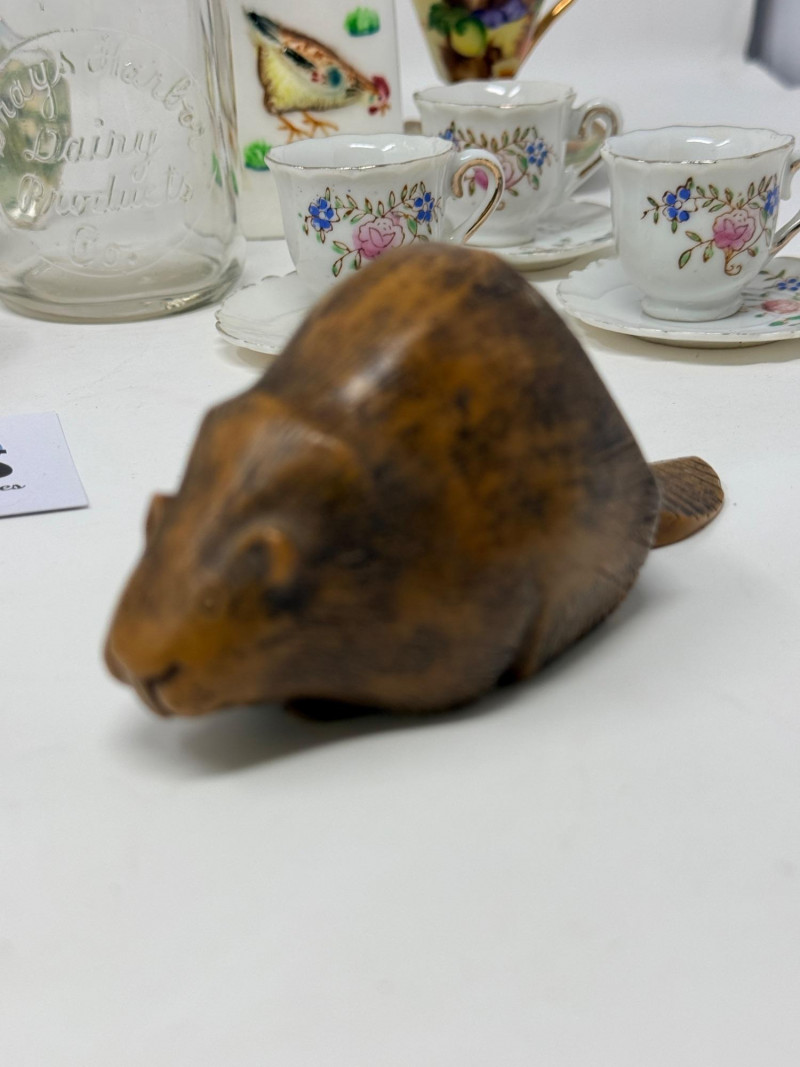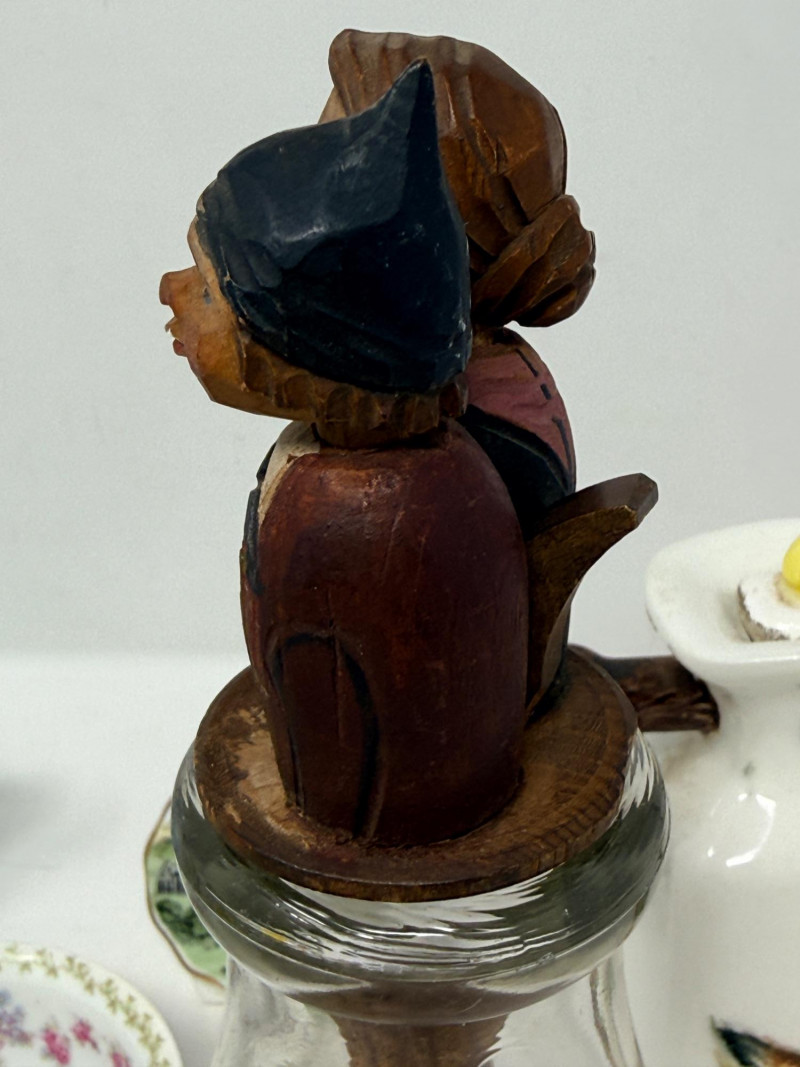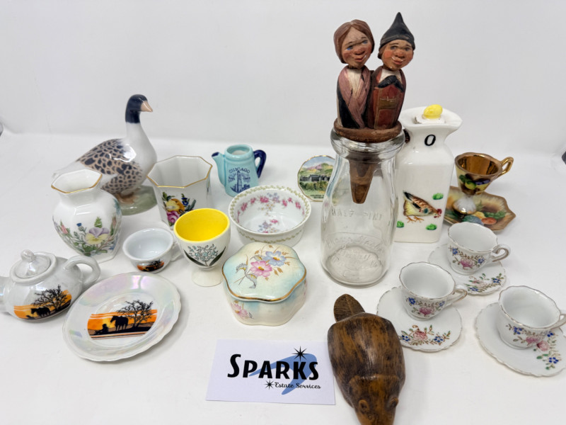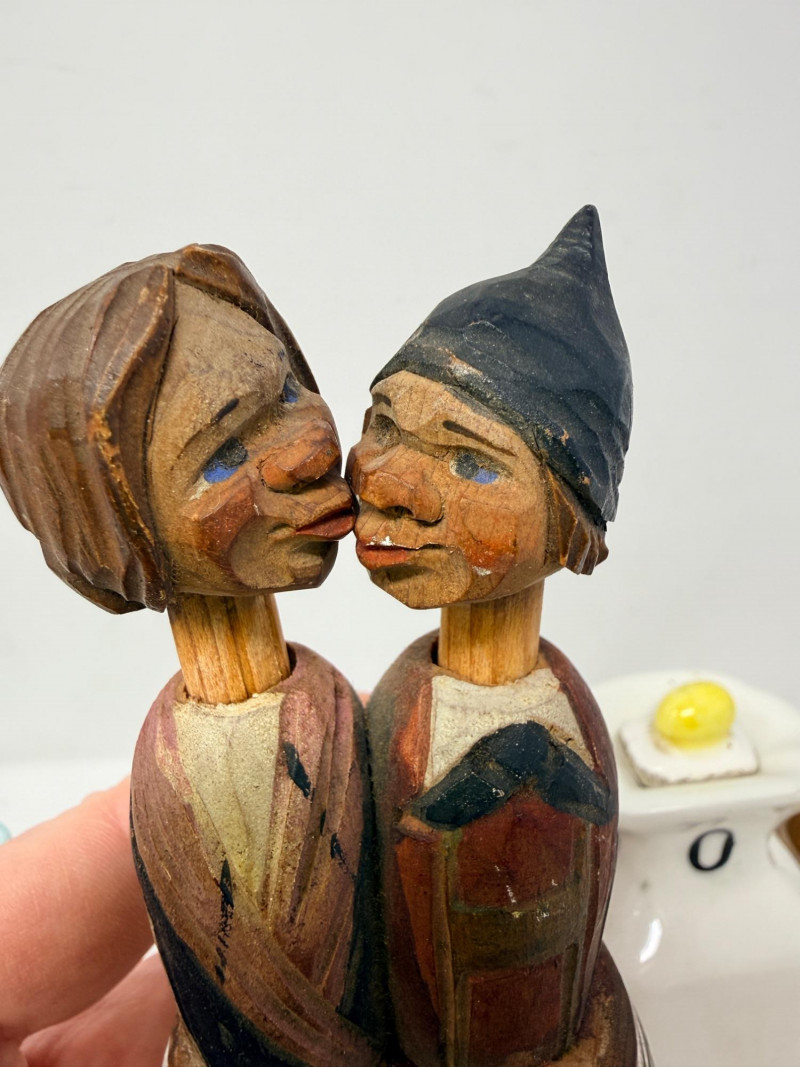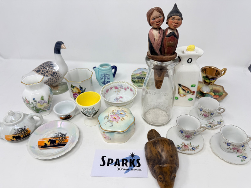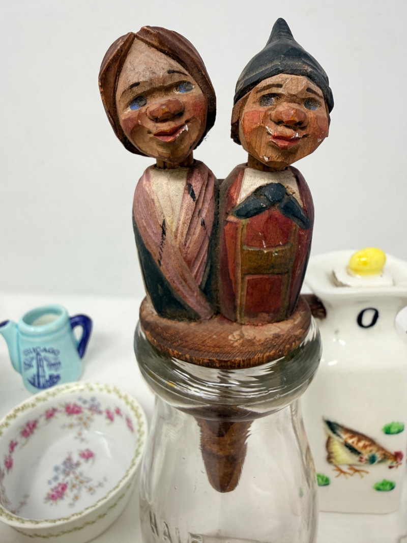 All The Small Things Half pint milk glass from Grays Harbor Dairy Products Co Anri Italian Kissing Couple hand carved wood bottle stopper with lever that turns the heads and they kiss Egg cup Trinket box and bowl Royal Copenhagen Porcelain Goose Statue Chicken mini pitcher