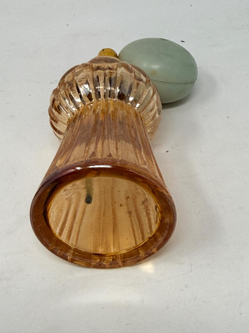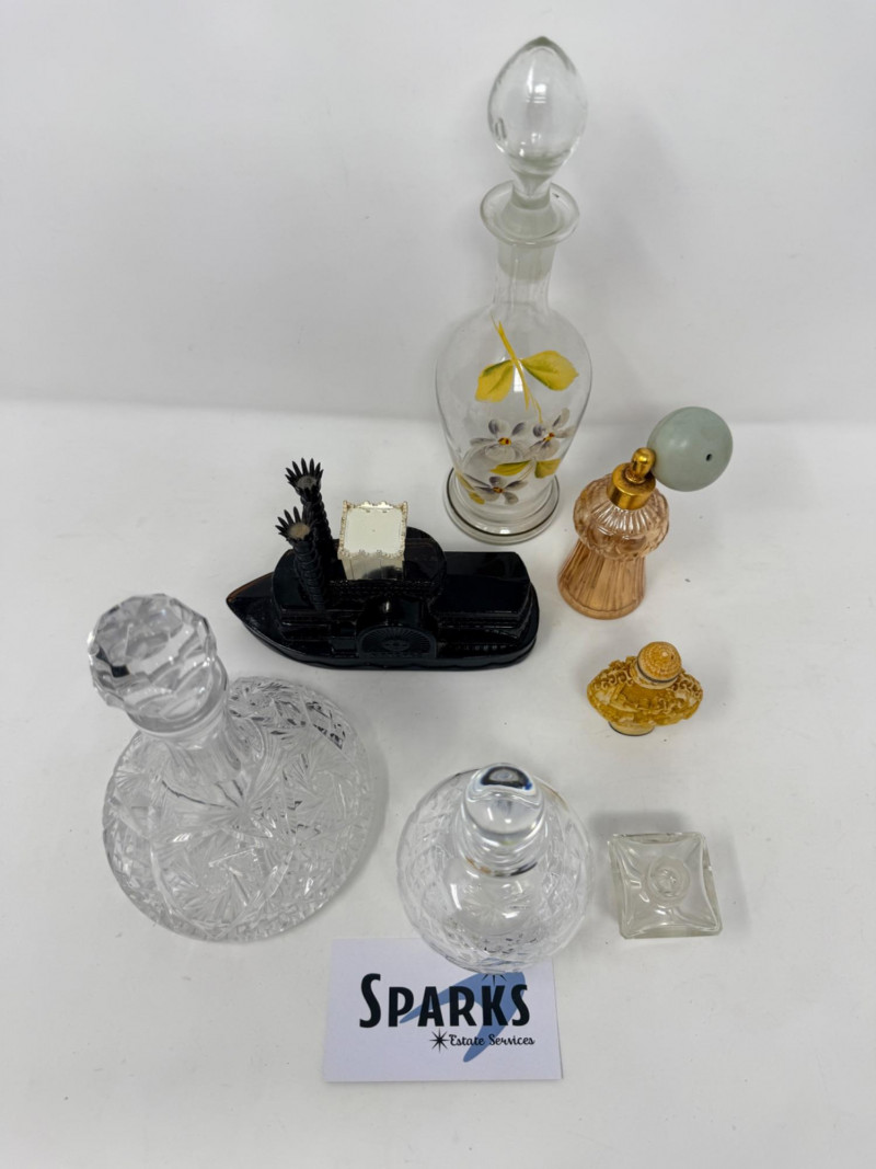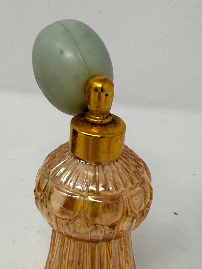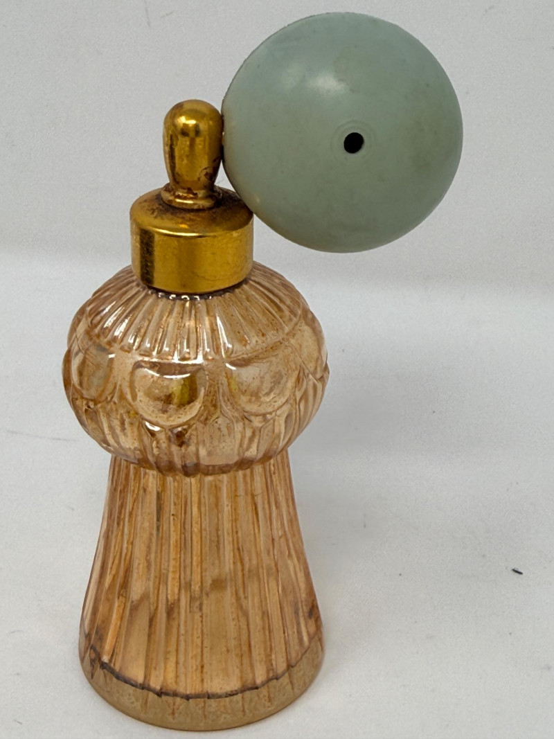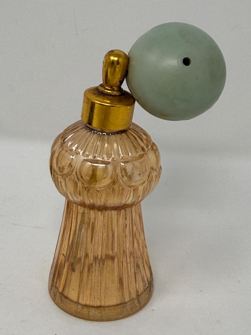 Vintage glass perfume atomizer bottle, likely from the mid-20th century, manufactured by I.W. Rice & Co. Amber or clear ribbed glass body with a gold-toned metal collar and a spray bulb. Features a vertical ribbed or "pumpkin" design, reflecting Art Deco or Depression glass styles 4.5” Diamond cut Crystal ships decanter with faceted stopper.