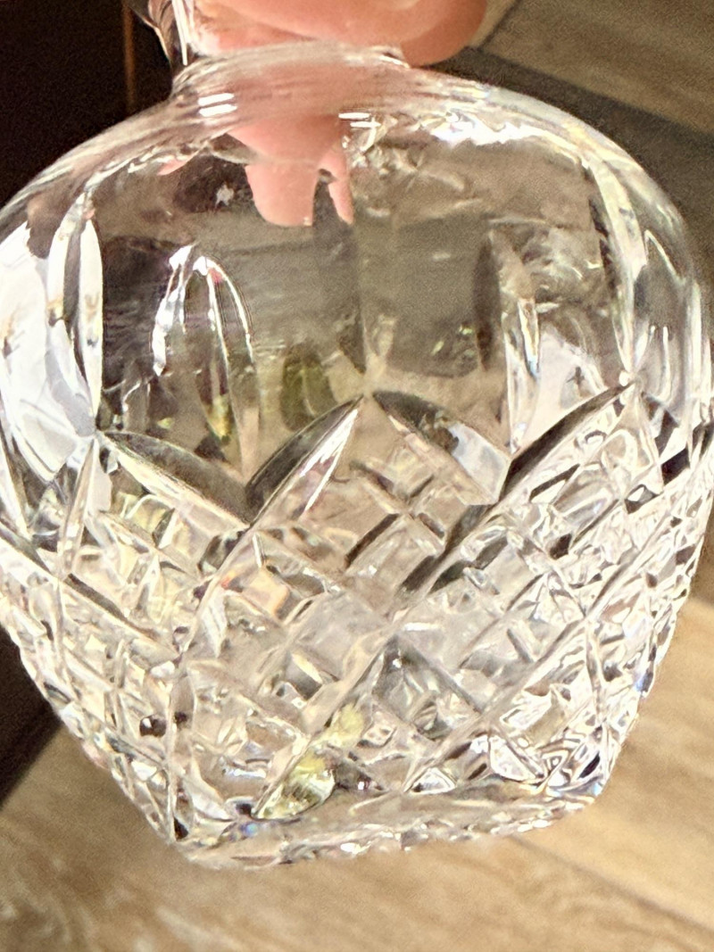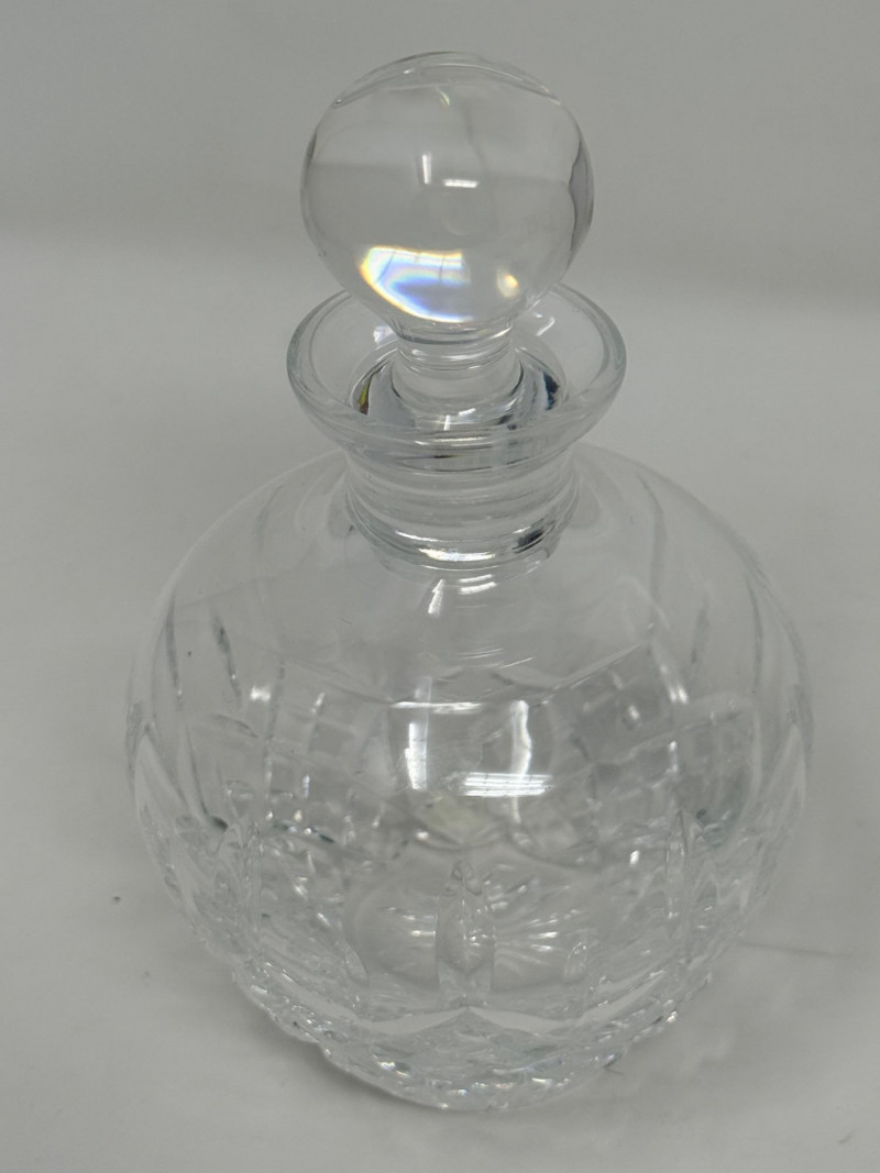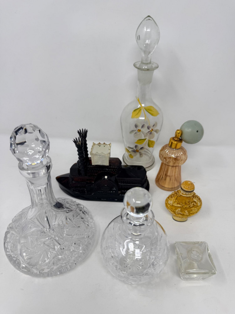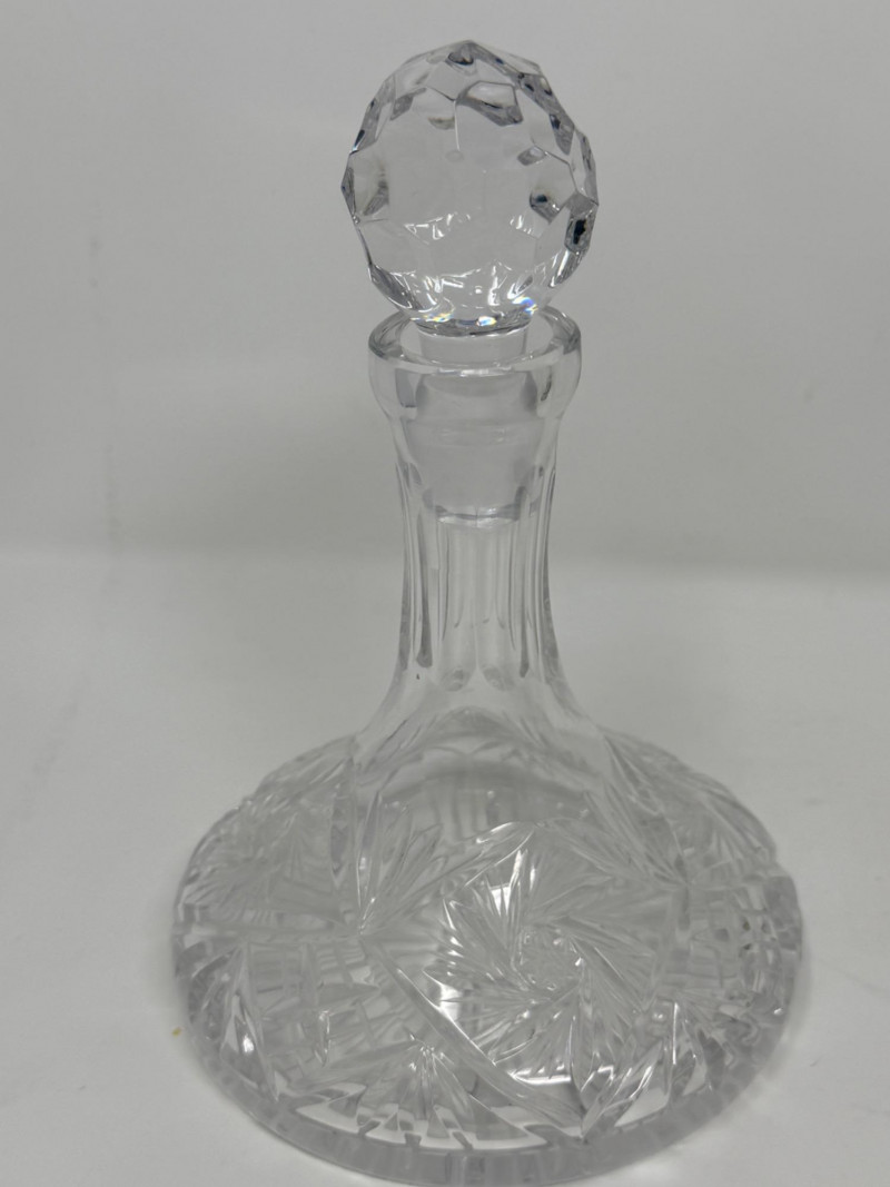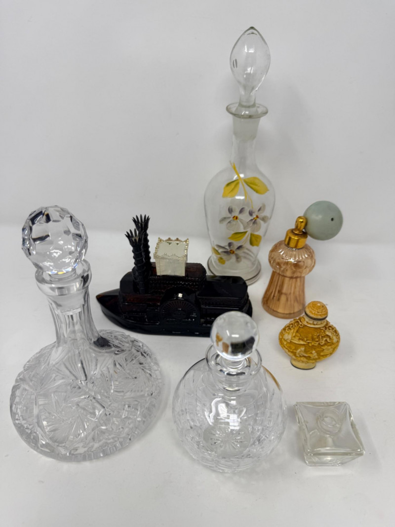 Vintage glass perfume atomizer bottle, likely from the mid-20th century, manufactured by I.W. Rice & Co. Amber or clear ribbed glass body with a gold-toned metal collar and a spray bulb. Features a vertical ribbed or "pumpkin" design, reflecting Art Deco or Depression glass styles 4.5” Diamond cut Crystal ships decanter with faceted stopper.
