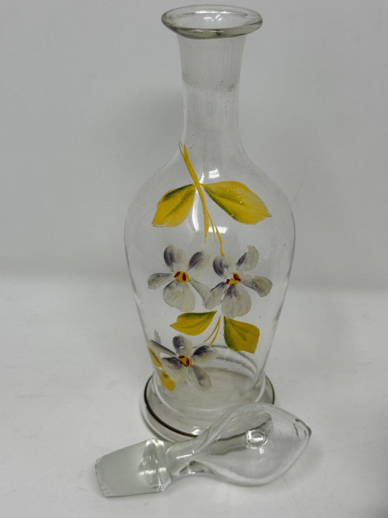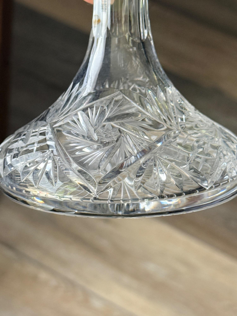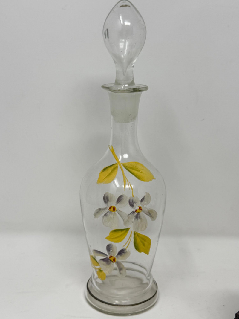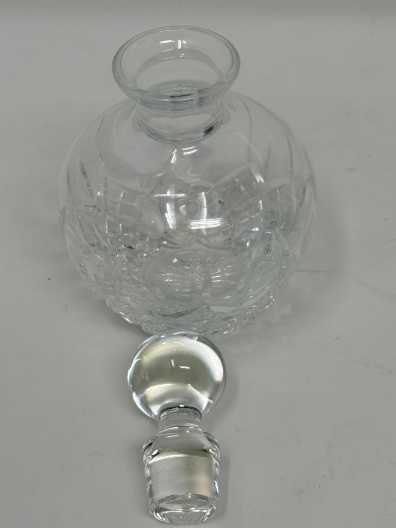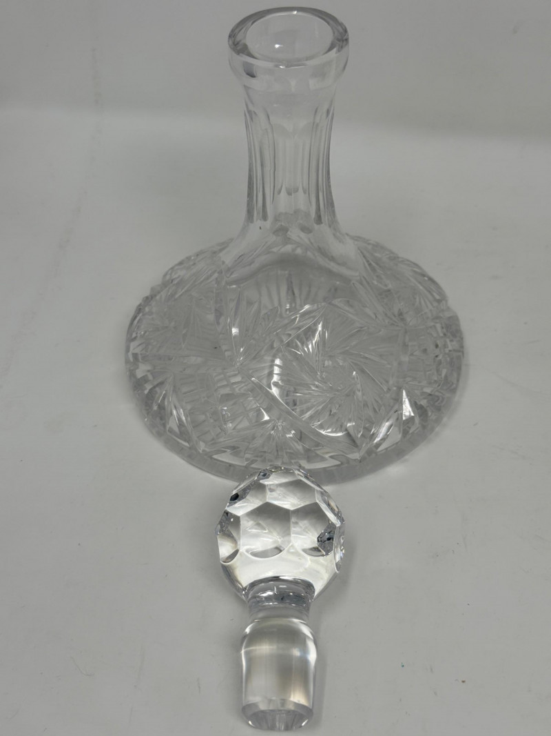 Vintage glass perfume atomizer bottle, likely from the mid-20th century, manufactured by I.W. Rice & Co. Amber or clear ribbed glass body with a gold-toned metal collar and a spray bulb. Features a vertical ribbed or "pumpkin" design, reflecting Art Deco or Depression glass styles 4.5” Diamond cut Crystal ships decanter with faceted stopper.